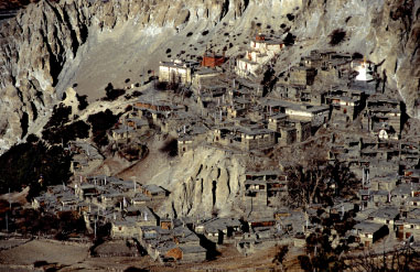 Der Weg nach Braga (3 450 m.ü.d.M.) ist nur kurz, wir benötigen etwa 45 Minuten. Auch Braga ist ein ungemein interessanter Ort mit typischen am Berghang erbauten ineinander verschachtelten Gurunghäusern. Ganz oben thront eine uralte Gompa. Leider ist ein Hereinkommen unmöglich, sie ist ständig verschlossen.