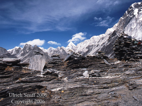 Mehr und mehr bewege ich mich im Zeitlupentempo, jeder Schritt wird zur Willensfrage. Nach dreieinhalb Stunden geschafft und wir werden für die Anstrengung mit einem ähnlich grandiosem Ausblick, wie vom Gokyo Rhi belohnt. Um uns herum liegen die Achttausender Lhotse (8 516 m) und Makalu (8 463 m) sowie die Sechs- und Siebentausender Pumori, Nuptse, Island Peak, Kanglemu, Ama Dablam, Tsumkari und Baruntse.