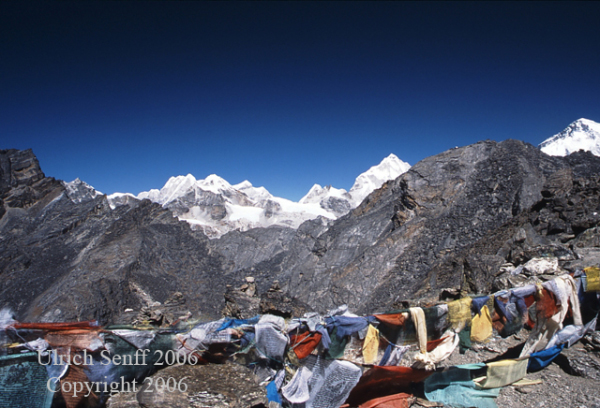 Zunächst geht es sehr steil etwa 100 m aufwärts, dann wird es endlich flacher. Ohne Atemprobleme wäre der technisch ziemlich einfache Aufstieg ein Genuss. Doch so.... ich zwinge mich zu jeder Bewegung, zähle die Schritte, 200 sind Satz, dann Pause, ... langsam kommt der Atem zur Ruhe, ... wieder 200 Schritte ..., zwei Stunden lang. Endlich der Gipfel, 5 330 m, Glückwünsche und natürlich viele Fotos. Um uns wehen viele bunte Gebetsfahnen. Der Luftdruck liegt jetzt bei 510 mbar. Dazu Sonnenschein, eine Traumsicht und Temperaturen um die 10° C.Ein atemberaubendes Panorama liegt vor uns, wir stehen auf dem vielleicht schönsten Aussichtspunkt dieser Erde. Unzählige schneebedeckte Gipfel im Umkreis von 360 °. Die ganze Pracht beginnt mit den Achttausendern Cho Oyu, Everest, Lhotse und Makalu. Dazu kommt eine Fülle von Sechs- und Siebentausendern wie Tramserku, Taboche, Cholatse, Kang Taiga, Ama Dablam. Auf der anderen Seite fällt der Blick auf den geröllbeladenen Ngozumpa-Gletscher. Tief unter uns, wie vom Flugzeug aus, Gokyo-See und der Ort Gokyo.