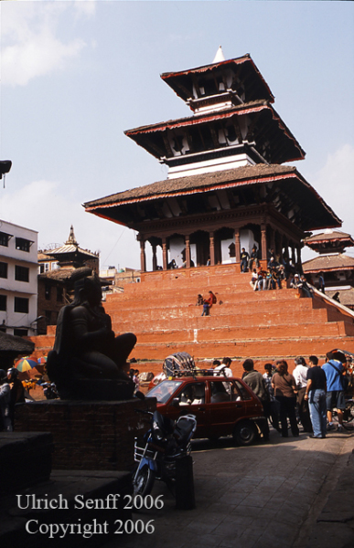 Nepals Hauptstadt Kathmandu liegt in 1 300 m Höhe. Die heute ca. 600 000 Einwohner zählende Stadt kann auf eine lange Geschichte zurückblicken. Viele Sehenswürdigkeiten sind das Ergebnis. Leider ist von der einst so romantisch wirkenden Stadt nur noch wenig übriggeblieben. Heute dominieren Hektik, Verkehrslärm und Smog. Die Autoschlangen in den Hauptstraßen verringern sich erst am späten Abend und beginnen erneut am frühen Morgen. Hinzu kommt ein immenses Bevölkerungswachstum aus den ländlichen Gebieten. Trotzdem, Kathmandu ist eine beeindruckende und interessante Stadt. Durbar Square: Die wichtigste Sehenswürdigkeit ist der Durbar Square. Zahlreiche, meist im 17. Jahrhundert entstandene Tempelanlagen und Paläste befinden sich hier auf engstem Raum. Glücklicherweise dürfen auf dem gesamten Gebiet keine Autos fahren. Ausländische Besucher müssen Eintritt bezahlen. "Durbar" heißt soviel wie "Königshof" und das Zentrum des Durbar Square ist der alte Königspalast. Die einst selbständigen Königsstädte des Kathmandutals, Kathmandu, Patan und Bhaktapur, besitzen einen solchen Durbar Square. Bilder vom Durbar Square Altstadt: Ungeheuer interessant ist die Altstadt von Kathmandu mit ihrem bunten Treiben. Auf zahlreichen Märkten wird alles Mögliche angeboten. Die Gassen in den verwinkelten Vierteln sind eng, die Häuser stammen aus den vergangenen Jahrhunderten. In den Nischen und Ecken findet man kleine Gebetsstätten für die verschiedensten Hindu-Gottheiten. Die heutige Struktur der Altstadt geht auf das 16. Jahrhundert zurück. Bilder der Altstadt Thamel: Hier befindet sich heute das touristische Zentrum. In dem quirligen Viertel reihen sich Hotels, Guesthouses, Internetcafes, Reiseagenturen, Geldwechsler, Restaurants und Souvenirshops in riesiger Anzahl aneinander. Leider ist normales Laufen in den engen Gassen kaum möglich, da sich zwischendurch Rikschas, Mopeds und Taxis meist ziemlich rücksichtslos ihren Weg bahnen. Der Smog ist demzufolge auch hier entsprechend hoch. Bilder von Thamel Andere Sehenswürdigkeiten: Weitere interessante Plätze sind Königspalast, New Road, Rani Pokhri, Bhimsen Tower u.a. Bilder von Kathmandu