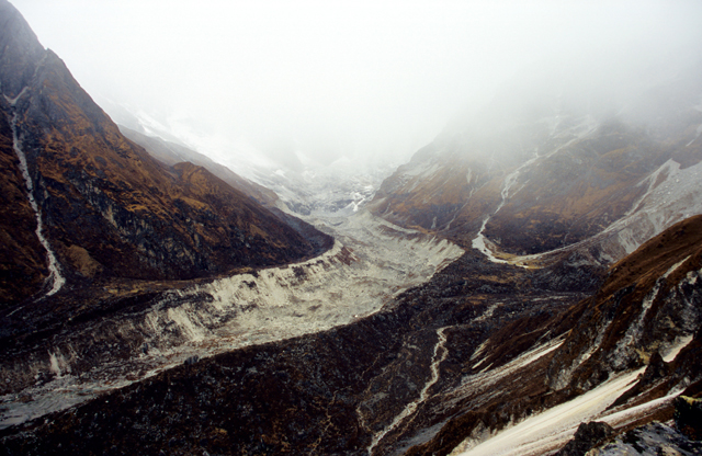 Danach erneuter Aufbruch in Richtung Lirung Gletscher. Wir passieren die alte Gompa, lassen auf der rechten Seite den Kyanjing Ri liegen und wandern auf recht ordentlichem Weg eine Stunde nach Norden. Dann geht es 250 m steil bergauf über viel Geröll, eine echte Bewährungsprobe. Das Ganze ist anstrengend und ein Abrutschen dabei immer möglich. Von oben werden wir trotz des noch immer trüben Wetters mit einem grandiosen Blick auf den Gletscher belohnt. Ein Weitergehen ist auf Grund der fortgeschrittenen Zeit nicht mehr möglich. Auch den Abstieg meistere ich gut und 17 Uhr sind wir wieder in Kyanjin.