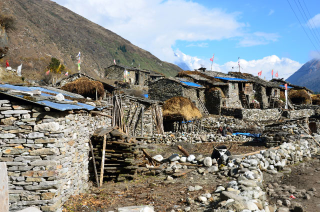Heute wohnt hier niemand mehr. Völlig allein – kein menschliches Wesen kreuzte bisher unseren Weg – machen wir bei Picknick mit Tibet Bread, gekochten Eiern und Apfeltee eine ausgiebige Pause, genießen dabei die schöne Bergkulisse mit Himal Chuli West (7540m), Himal Chuli (7893m), Manaslu Nord (7157m) und dem leider von Wolken verdeckten Manaslu (8163m). Die Mittagstemperatur liegt bei 20° C.