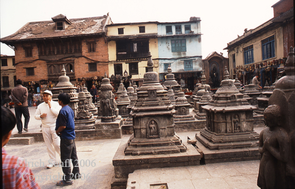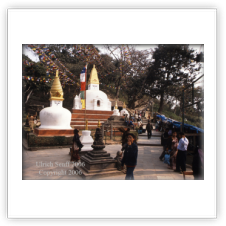 Die Stupa von Swayambhunath ist eines der heiligsten Orte des Kathmandutals und das vielleicht bedeutendste buddhistische Heiligtum in Nepal überhaupt. Sie liegt ca. 2 km westlich der Hauptstadt auf einem Hügel. Die uralte Anlage wurde in der Vergangenheit mehrfach renoviert. Ihre heutige Form stammt vermutlich aus dem 14. Jahrhundert. Zwei Wege, ein relativ kurzer an der Südseite und ein langer über 365 Stufen an der Ostseite führen nach oben. Besucher sollten den Einen beim Aufstieg, den Anderen beim Abstieg benutzen, beide sind interessant.
