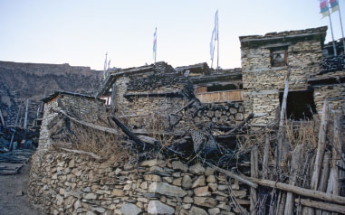 Nach acht Stunden liegt Ghyaru vor uns, die Häuser kleben förmlich am Berghang. Wir benötigen jedoch noch einmal eine Stunde, dann ist das Tagesziel in 3 670 m Höhe erreicht.