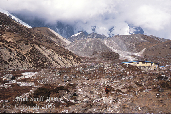 Wir entschließen uns, erst am Nachmittag nach dem Lunch die verhältnismäßig kurze Etappe nach Chukung durch das gleichnamige Tal in Angriff zu nehmen. Der Blick wird auf der gesamten Strecke vom allgegenwärtigen Ama Dablam beherrscht. Zum Anfang zeigt sich auch noch der Island Peak. Es geht langsam aber stetig bergauf, am Ende wird das Gelände immer unwegsamer. Die Atemfrequenz nimmt infolge der Höhe deutlich zu.