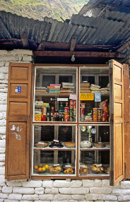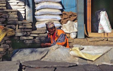 Hinter Ghorepani führt ein bequemer Weg zunächst steil abwärts bis Chitre in 2 300 m Höhe. Auch der weitere Weg durch relativ fruchtbares Gebiet verläuft problemlos. Nach fünf Stunden ist der Eingang unseres Übernachtungsortes Sikha in 1 940 m Höhe erreicht. Wir laufen noch zirka eine halbe Stunde durch den sich lang hinziehenden, nicht sonderlich sauberen Ort, erreichen dann am Ende einen Komplex mit mehreren einfachen Unterkünften.