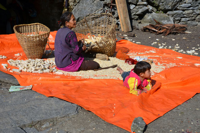 Immer wieder kommen uns Trekker entgegen, die auf Grund der Wetter- und Schneeverhältnisse den Larkya La nicht überqueren konnten. Wir können nur hoffen, dass die Zeit der Niederschläge endlich vorbei ist.