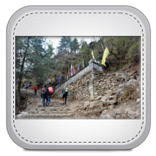 Nach dem guten Frühstück mit Tibet Bread, Omelett und Milchkaffee starten wir um 07:25 Uhr. Ich habe gut geschlafen und bin entsprechend gut drauf. Über uns fliegen unaufhörlich die Flieger von Kathmandu nach Lukla. Das Wetter ist gut und die Strecke bis auf wenige Ausnahmen einfach. Es geht stetig bergan. Nach einer Stunde liegt Lukla über uns. Wir passieren bald das Dorf Chaurikharka (2500m) und kommen zwei Stunden später im langestreckten Ort Cheplung (2660m) auf die Hauptstrecke von Lukla nach Phakding mit Tourismus pur. Unzählige Trekker sind unterwegs. Vieles hat sich seit meinem letzten Besuch verändert. Zahlreiche Unterkünfte sind entstanden, Häuser haben einen neuen Anstrich und alles ist sauber und ordentlich. Aber, möchte man das eigentlich? Im Dorf Thado Koshigaon auf 2580m Höhe machen wir in der „View Lodge“, unserer Übernachtungsstelle von 2012, eine kurze Teepause. Erinnerungen werden wach. In Phakding (2600m) ist Lunchzeit in der „Snowland Lodge“. Auch das ist ein Neubau. Reisegruppen sitzen an langen Tischen. Am Ende von Phakding passieren wir die lange Hängebrücke über den "Dudhkosi". Es trübt sich ein und hin und wieder fällt etwas Regen vom Himmel. Wir überqueren mehrmals den Dudhkosi auf Hängebrücken und passieren die Dörfer Benkar, Toktok und Chamuwa. In Benkar erfolgt eine kurze Teepause. Im folgenden langgestreckten Dorf Monjo müssen zwei anstrengende Auf- und Abstiege überwunden werden. Am Ende des Dorfes auf 2855m Höhe ist am Kontrollpunkt ein neues Trekkingpermit fällig. Hier beginnt die Khumbu-Region. Der höchste Punkt von Monjo liegt dagegen 2977m hoch. Nach einem langem Abstieg über Treppen erreichen wir schließlich unseren Übernachtungsort Jorsalle, das letzte Dorf vor dem langen Aufstieg nach Namche Bazar. Jorsalle liegt auf 2740m Höhe. In der sehr schön am reißenden Bergfluss Dudhkosi gelegenen „Friendship Lodge“, kommen wir um 17.30 Uhr an. Wir sind die einzigen Gäste. Erstmals auf der Reise erlebe ich wieder eine europäische Toilette. Es wird schnell kalt am Abend. Mein ausgewähltes Dinner, eine Cheese-Mushroom-Pizza schmeckt gut. Nach dem Schreiben der Tageschronik ist 21 Uhr Nachtruhe.