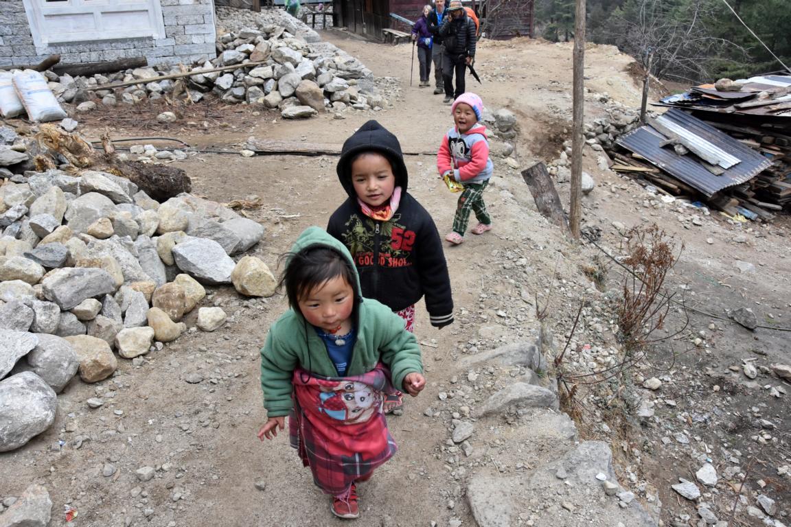 Nach gut durchschlafener Nacht und dem Frühstück mit Tibet Bread, Jam und Honig 07:15 Uhr Start bei Sonnenschein und Temperaturen um den Gefrierpunkt. Der Weg führt sofort steil aufwärts, bereitet jedoch keine Probleme. Nach zwei Stunden erreichen wir mit dem Kari La auf 3059m den höchsten Punkt des Tages. Der steile Abstieg wird schwieriger. Nach einer Stunde haben wir bei 2800m die Weggabelung nach Jiri erreicht. Die weitere Strecke kenne ich von meiner Tour 2012. Nach jetzt angenehmer Wanderung ist Paiya (2730m) um 12 Uhr erreicht. In der „Dreamland Lodge“ ist Lunchzeit. Schräg gegenüber habe ich vor sechs Jahren übernachtet. Das Gebäude steht heute leer und der Betreiber hat neu gebaut.