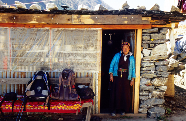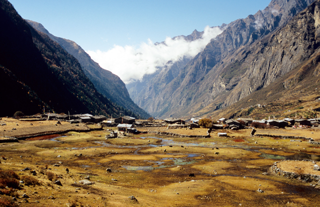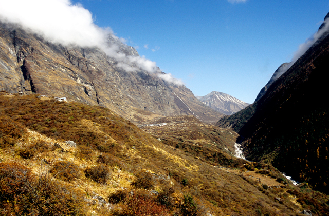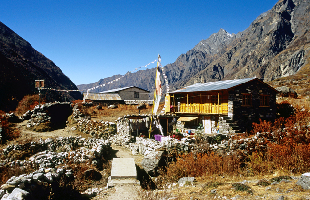 Heute verlassen wir nach vier Nächten Kyanjin und wandern auf altbekannter Strecke zurück nach Westen. Als Tagesziel ist das 17 km entfernte Lama Hotel geplant. Wir nehmen uns Zeit, starten schließlich um 08.30 Uhr bei erneut herrlichem Sonnenschein. Nach zwei beschaulichen Stunden ist das Dörfchen Mundo (3450 m) erreicht. Wir trinken in einem Teehaus Tee, benötigen dann nur wenig Zeit bis nach Langtang (3400 m). Beim Durchqueren der engen Gassen des großen Dorfes nehme ich noch einmal das Flair und die beeindruckende Berglandschaft in mir auf. Zum Lunch ist es allerdings noch etwas früh, wir wandern weiter bis Thyangsyapu (3200 m). Danach nimmt die Vegetation zu, die Strecke wird auch wieder schwieriger und wir beschließen bereits in Thomna, nach 14 km auf 2800 m Höhe zu übernachten. Die Unterkunft ist zwar einfach doch ausreichend. Der Tsergo Ri steckt noch immer in den Knochen.