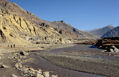 Am folgenden Tag wandern wir zunächst noch ein Stück auf der Straße, dann endlich im ausgetrockneten Flussbett des Kali Gandaki. Nach knapp zwei Stunden ist Jomsom (2 750 m) erreicht. Jomsom ist ein größerer, sich über ca. zwei Kilometer hinziehender Ort ohne Sehenswürdigkeiten. Hier befindet sich jedoch der einzige Flugplatz der Region. Flüge finden jedoch nur bei optimalem Wetter statt. Des weiteren steht in Jomsom ein recht großes und gut ausgestattetes Hospital. Der weitere Weg verläuft am Flussufer, aber auch im ausgetrockneten Flussbett des Kali Gandaki. Uns umgibt eine grandiose Berglandschaft. Immer um 11 Uhr setzt in der Region um Jomsom ein kräftiger Wind ein. Dabei treten Sturmböen unkontrolliert und oft in heftiger Stärke auf und fegen riesige Sandwolken vor sich her. Wir tragen Tücher vor dem Gesicht, versuchen uns so wenigstens einigermaßen zu schützen. Nach sieben Wegstunden ist unser Tagesziel Kagbeni in 2 800 m Höhe erreicht.