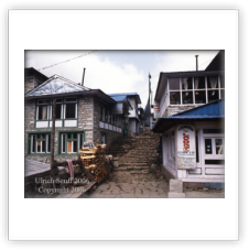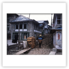 Nach drei Stunden endlich geschafft und auch ein bisschen müde. Phakding liegt auf 2 600 m. Natürlich muß sich der Körper auf Höhen weit über 2 000 m erst einstellen. Das Wetter ist fantastisch, strahlender Sonnenschein bei Tagestemperaturen um die 20° C.