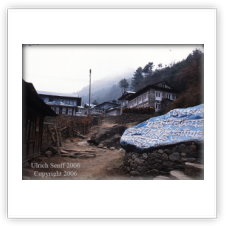 Den folgenden Tag nutzen wir zur Akklimatisation. Nach einer kalten Nacht, morgens etwa + 5° C, Aufbruch zur Gomlha Dzamgang Gompa auf 2 760 m Höhe. Gompas, buddhistische Klöster, findet man im Khumbu recht oft. Die Berühmteste und Größte des Gebietes steht in Tengboche.