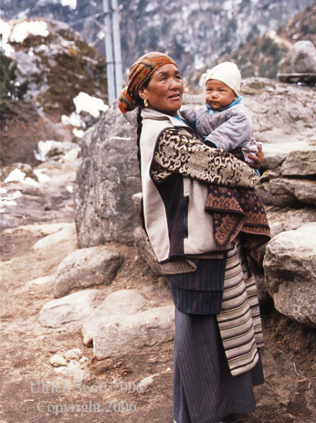 Auch wenn die Tour praktisch zu Ende und die Luft heraus ist, wollen wir dem letzten Seitental einen Besuch abstatten. Ursprünglich war geplant, bis Thame, dem letzten Ort des Tals, zu wandern und dort zu übernachten. Leider haben wir wiedereinmal wenig Glück mit dem Wetter, es ist trüb, die Sicht nicht allzu gut und immer wieder fallen Niederschläge, meist als Schneeregen. So beschließen wir, nur die halbe Strecke bis Thamu zu gehen und am gleichen Tag zurückzukehren. Wir steigen zunächst in Namche ziemlich steil nach oben. Nach einem letzten Blick auf die quirlige Siedlung verschwinden die Häuser hinter einem Bergrücken. Die Strecke führt jetzt durch herrliche Tannen- und Rhododondronwälder, hoch über den Schluchten des Tsangpo-Flusses.