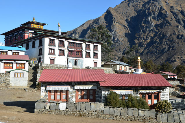 Erstmals auf der Tour empfängt uns der Morgen mit leichtem Schneefall und dichtem Nebel. Gleich hinter Namche Bazar beginnt ein schöner Höhenweg. Leider ist die Sicht aufgrund des Wetters eingeschränkt. Vor dem Dörfchen Kyangjuma (3550m) passieren wir den Abzweig nach Khumjung. In Phunki Drangka, dem mit 3250m Höhe tiefsten Punkt im Khumbu ist Zeit zum Lunch. Jetzt beginnt auch noch ein richtig heftiger Schneeregen. Was hilft´s, es geht weiter, zunächst auf einer Hängebrücke über den Phunki Khola, dann 600m steil aufwärts nach Tengpoche. Der Weg ist einfach aber natürlich anstrengend. Ich habe jedoch keine Schwierigkeiten. Irgendwann hört auch der Niederschlag auf und Klärchen lässt sich ein wenig blicken. Am Nachmittag erreichen wir die berühmte Monastry von Tengpoche in 3860m Höhe. Übernachtung wieder im von vor sechs Jahren bekannten Tengpoche Guesthouse. Leider sind alle Zimmer besetzt, ich muss mit einem sehr einfachen Raum im Nebengebäude vorlieb nehmen. Tengpoche liegt am Südhang des Thamserku (3860m) und bietet großartige Ausblicke auf Everest, Lhotse und Ama Dablam. Das buddhistische Kloster ist das wichtigste religiöse Zentrum im Khumbu. Es wurde 1923 erbaut, 1989 durch einen Brand zerstört und zwei Jahre später wieder aufgebaut. Im Umfeld des Klosters entstanden mehrere Unterkünfte.