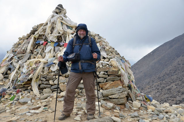 Am folgenden Morgen mache ich bei wieder schönem Sonnenschein ein paar Fotos, dann Start. Der Weg führt zunächst durch Waldgebiet 200m abwärts bis Deboche (3626m). dann wandern wir auf einem schönen Höhenweg leicht aufwärts bis Pangpoche (3900m). Nach einer Teepause führt wiederum ein problemloser Weg bis zum kleinen Dorf Shomare. Tief unter uns fließt der Imja Khola. Nach Lunch in einem der zahlreichen Gästehäuser gehen wir weiter auf einem Plateau langsam bergauf. Die Vegetation lässt spürbar nach, der Wind weht kräftig und es wird anstrengend. Nach 1,5 Stunden ist mit dem Pheriche Pass auf 4270 m Höhe der höchste Punkt des Tages erreicht. Drei Chörten, die an ums Leben gekommene Bergsteiger erinnern, stehen hier. Erstmals erblicken wir unser Tagesziel Pheriche. Auf schmalem Weg geht es hinunter nach Pheriche (4200m). Unsere Übernachtungstelle, das Hotel Nagarkot liegt am südlichen Rand des Sherpadorfes Pheriche. Die Etappe hatte es in sich und ich spüre auch meine Knochen. Am Abend im Gastraum lernen wir drei nette Amerikaner kennen, Vater 65 Jahre, seine Frau und der Sohn.