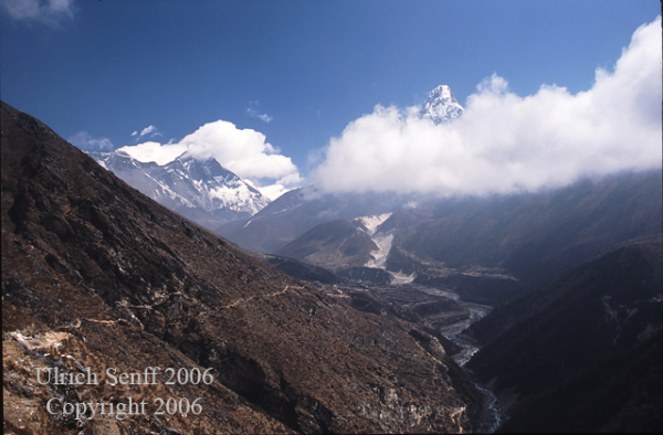 nach einem reichhaltigem Frühstück mit Cheese-Omelett und Toast, sowie Butter mit Chapati beginnt um 9 Uhr die nächste Etappe nach Pangboche. Wie bereits gewohnt geht es mal wieder steil bergan, ein Höhenunterschied von 200 m ist zu überwinden. Der Blick auf Phortse ist von dort aus großartig. Weiter geht es auf schmalen Wegen unentwegt über kräftezehrende Anstiege und gleich danach wieder steil abwärts. Bald öffnet sich uns der Blick zum Ama Dablam, sowie auf Nuptse, Everest und Lhotse.
