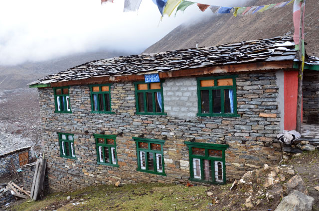 Unser Ziel Dharamshala erreichen wir um 13 Uhr. Das Base Camp des Larkya La oder Larke Passes besteht aus ein paar Steingebäuden mit Gastraum, einigen Zimmern und zahlreichen Zelten.