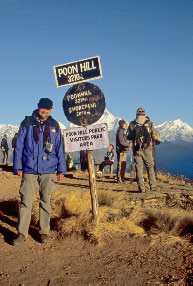 Am nächsten Morgen klingelt bereits um 04.30 Uhr der Wecker und 30 Minuten später brechen wir in völliger Dunkelheit zum Poon Hill, einem der schönsten Aussichtspunkte Nepals, auf. 350 Höhenmeter sind zu überwinden. Bald befinden wir uns in einer Schlange, unzählige Trekkingtouristen schieben sich langsam Meter für Meter nach oben. Nach einer knappen Stunde endlich oben in 3 200 m Höhe. Wir stehen gemeinsam mit vielen hundert Menschen auf der riesigen Plattform. Ich bin noch ein wenig vom Aufstieg durchgeschwitzt, bald macht sich jedoch die Kälte bemerkbar. An einem Kiosk wird mit Kaffee und Tee vorgesorgt. Wir erleben ein fantastisches Bergpanorama. Die Gipfel von Dhaulagiri, Tukuche, Nilgiri, Annapurna South, Hiun Chuli, Machhapuchre und Annapurna III werden von der roten Morgensonne angestrahlt, für jeden Natur- und Bergfreund ein großartiges Erlebnis.