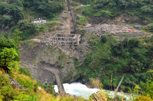 Nach dem Lunch beginnt es wieder kräftig zu regnen. Wir wandern weiter auf der Straße, die in Serpentinen abwärts führt. Tief unter uns in Tallo Chipla entsteht ein modernes Wasserkraftwerk. Geplant war eigentlich, noch bis Bahundanda weiterzugehen, doch aufgrund des Regens ist in Syange auf 1100m Höhe um 15.30 Uhr endgültig Schluss. Unser Wasserfall-Hotel ist ein recht großes Haus mit 43 Betten direkt am Fluss. Am Abend kommen noch zahlreiche Trekker, die die Annapurna-Runde machen wollen, sowie fünf Amerikaner, deren Ziel Rafting auf dem Marsyangdi-Fluss ist.