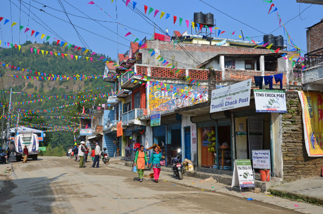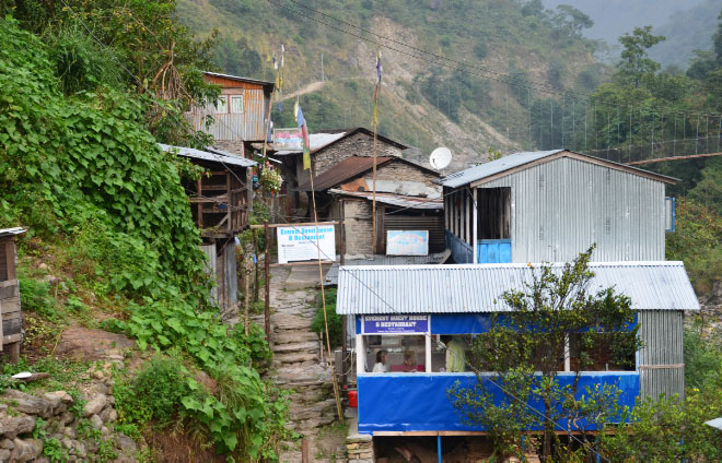 Jagat ist ein lebhafter, angenehmer Ort mit zahlreichen Unterkünften und Geschäften.