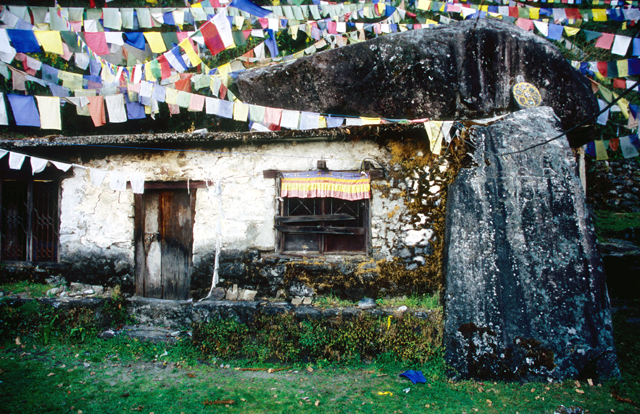 Nach einem ausgiebigen Frühstück mit Milchtee, Kartoffelbrot – eine Art Kartoffelpuffer, Eier, Butter und Jam starten wir um 08.30 Uhr. Nach wenigen Hundert Metern auf dem Bergrücken folgt ein steiler Abstieg von 1000 Metern. Der Weg ist teilweise schwierig, führt auch über Geröll. Hinzu kommt mein mehr und mehr schmerzendes Knie. Entschädigt werden wir von einem herrlichen Rhododondronwald. Wir machen immer wieder Pausen, benötigen deshalb für die recht kurze Strecke bis zum Tagesziel Melamchigaon auf nur noch 2600 m Höhe vier Stunden. Den Nachmittag nutze ich zu einer kleinen Entdeckungstour durch das in herrlicher Mittelgebirgsregion gelegene weitverzweigte Dorf. Wir wandern zunächst zu einer alten Gompa ganz nach oben. Von hier aus hat man einen schönen Blick über den Ort. Danach laufen wir zum unteren Teil des Dorfes, auch dort steht eine Gompa.