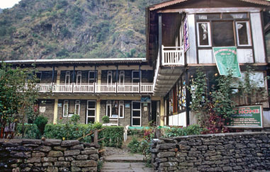 Auf der Etappe nach nach Dharapani wandern wir zunächst am Rande eines herrlichen Tals bis Timang (2 700 m). Von hier aus hat man einen herrlichen Blick auf den Manaslu 8 156 m). Danach steiler Abstieg über viel Geröll und Treppen bis Danakyu (2 300 m) Weiter geht es auf recht gutem Weg über Bagarchhap (2 160 m) vorbei am Startpunkt zum Manaslu-Trek bei Thoche – hier treffen die Flüsse Dudh Khola und Marsyandi aufeinander - zum Zielort Dharapani (1 860 m). Für diesen Abschnitt benötigen wir sieben Stunden. Auch hier stehen die Unterkünfte größtenteils leer.