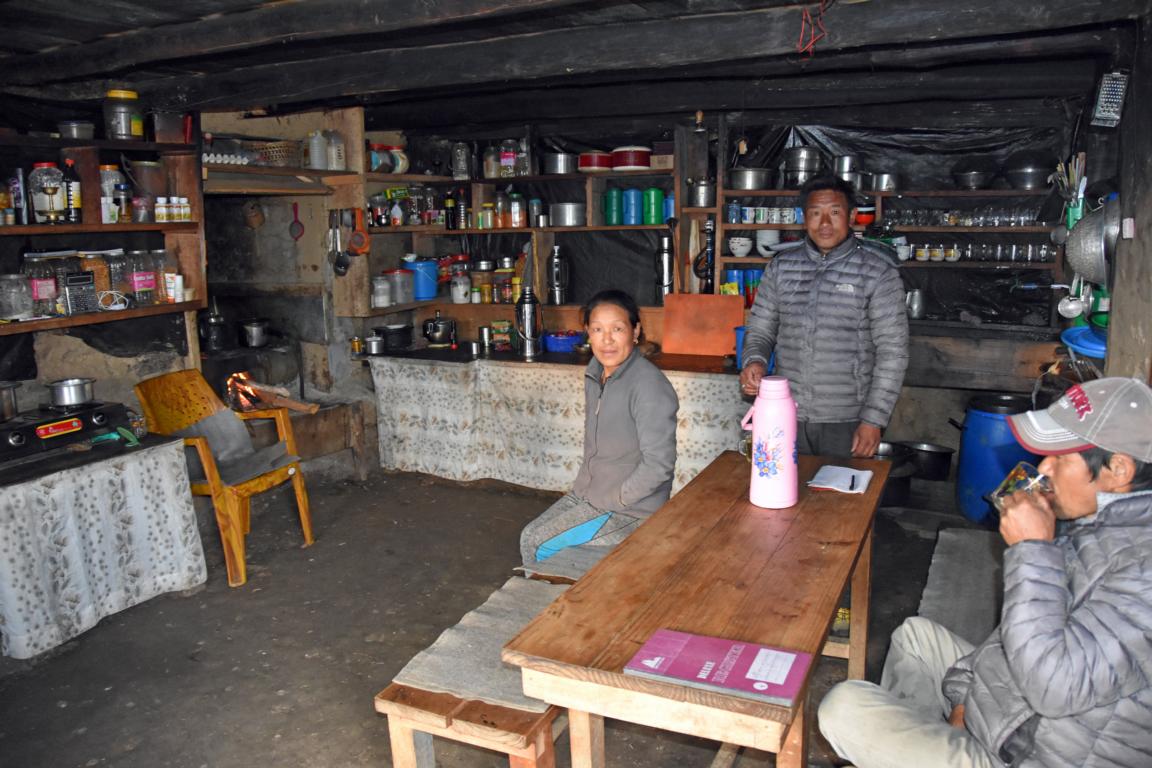 Wie üblich stehe ich um 6 Uhr auf. Zum Frühstück gibt es Chapati mit Omelett. 07.20 Uhr ist Start. Die Strecke führt zunächst durch Gudel mehr als 200m abwärts. Der weitere Abstieg verläuft über viel Geröll und volle Konzentration sowie Trittsicherheit sind notwendig. 09:40 Uhr erreichen wir mit dem Fluss Hongu Khola den tiefsten Punkt des Tages. Nach dem Überqueren des Flusses auf einer Hängebrücke sind bald die ersten Häuser des ca. 4500 Einwohner zählenden Dorfes Bung erreicht. Auf der „Mainstreet“ geht es über unzählige Granitstufen bei Sonnenschein steil aufwärts. Bung erstreckt sich von hier aus über fünfhundert Meter nach oben. Teatime machen wir um 10.30 Uhr auf 1400m Höhe. Auch in Bung sind die Menschen freundlich und suchen den Kontakt. Hier beginnt der Makkalu-Nationalpark und fürs Trekkingpermit werden rund 4000 Rupies, ca. 32 Euro, fällig. Am oberen Ende von Bung machen wir in der „Panch Pokhari Lodge“ auf 1830m Höhe um 13 Uhr Lunch. Wie überall sind wir die einzigen Gäste, alles wird demzufolge frisch zubereitet und die Wartezeit ist entsprechend lang. Dann zieht wieder ein Gewitter auf. 15 Uhr lässt der Regen endlich etwas nach. Trotz einiger schwieriger Aufstiege bereitet mir die Strecke keine Probleme. Um 17 Uhr erreichen wir mit unserem Übernachtungsort Khiraule auf 2350 m Höhe ein Dorf mit ein paar wenigen verstreut liegenden Häusern. Die „Soni Garden Lodge“ ist einfach aber gemütlich. Unsere Pritschen stehen in einem großen Schlafsaal. Im Gastraum trinken ein paar Dorfbewohner Dhumba, das beliebte Heißgetränk aus gegorener Hirse. Mir schmeckt das auch, heute verzichte ich jedoch darauf. 20:30 Uhr ist Nachtruhe.
